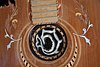 Dessus en cèdre avec touche d'ébène. Pont en bois de rose, dos et côtés en érable frisé. Joint : à la 12e frett. Zéro Frett